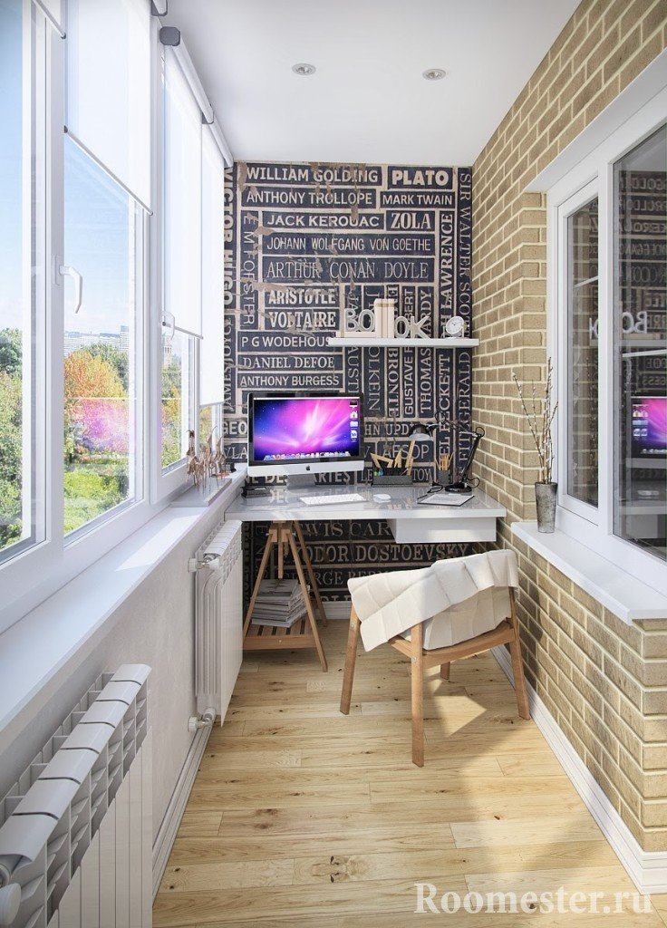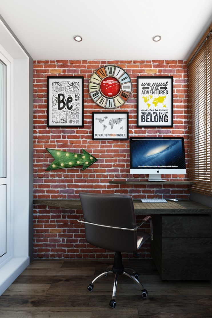 Традиционно рабочие кабинеты оформляются лаконично, но на балконе можно немного отойти от правил. Одним из интересных современных решений отделки балкона 2018 является сочетание в оформлении выкрашенной в белый кирпичной кладки с черной стеной.