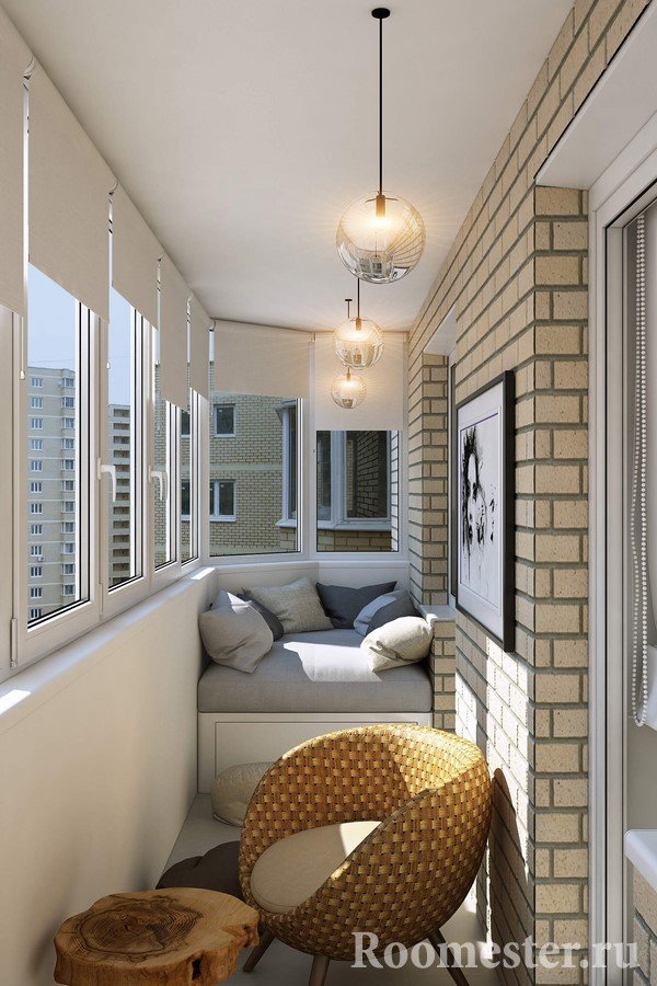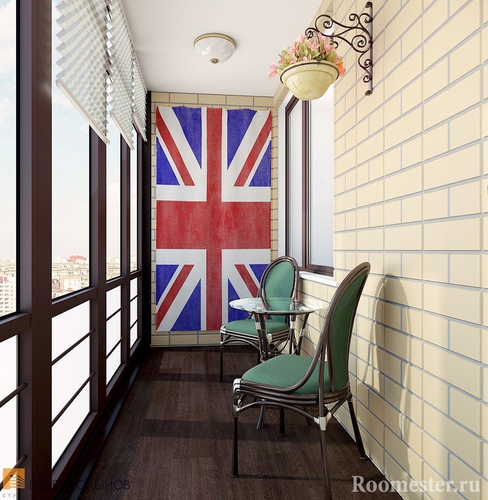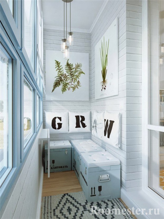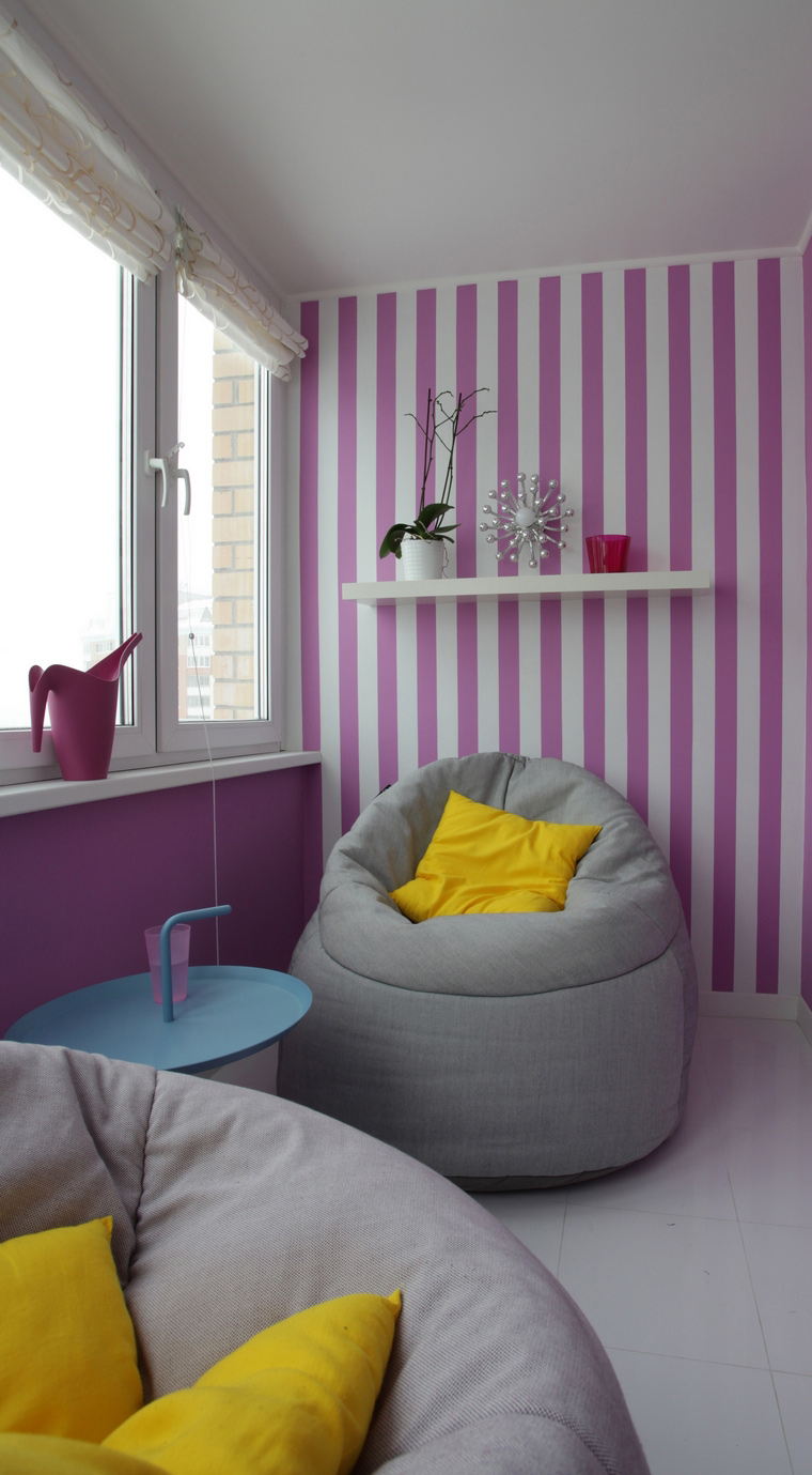 Достаточно интересный способ оформления балконов. Мебель здесь можете использовать бескаркасную, также подойдут плетеные кресла, отделку можно сделать при помощи декоративных панелей, на которых нанесен оригинальный рисунок. Также не забывайте об аксессуарах. В качестве украшений можно вешать картины, на окна – цветные жалюзи или другие яркие занавески. Не будут лишними и живые цветы. Цветовую палитру можно применять различную, например белый с коричневым, а также и мятный цвет или голубой, красный и синий.