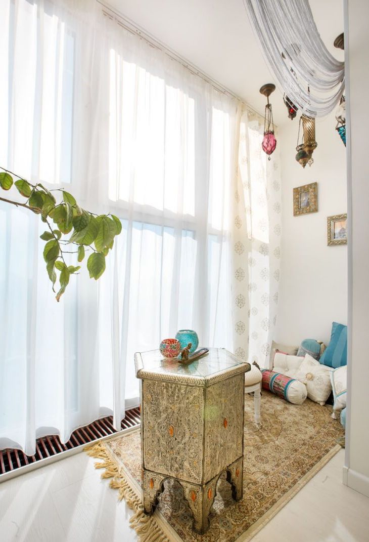 Здесь можно зонировать помещение, благодаря ширмам и перегородкам. Обустраивайте максимальное освещение. Именно поэтому данный стиль прекрасен для балконов с панорамным остеклением.