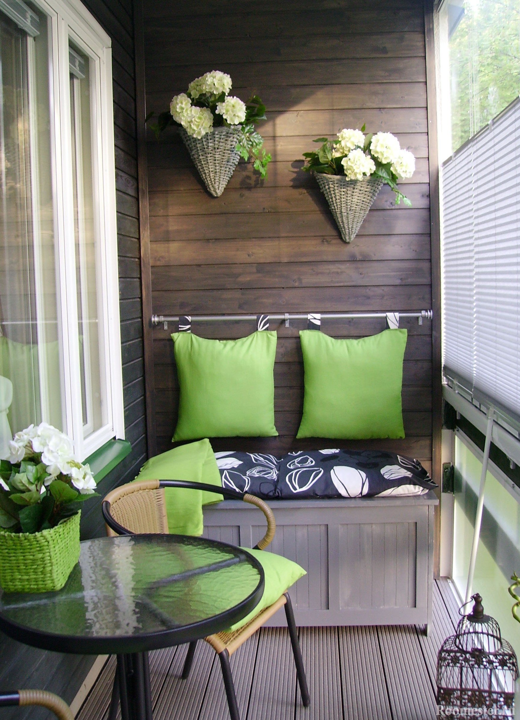 Приобретите удобную и компактную мебель для сидения. Угловая мебель поможет максимально увеличить пространство и создать красивую обстановку. Декоративные аксессуары, растения в напольных и подвесных горшках, шторы или жалюзи, подушки помогут полностью ощутить романтику нового места отдыха.
