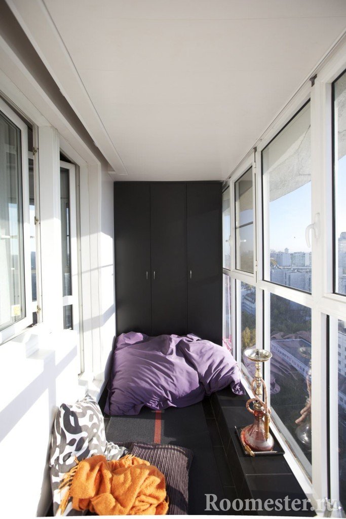 На таком балконе можно даже сделать разные зоны при помощи различных перегородок или ширм. Здесь Вы сможете создать прекраснейший вариант для отдыха. Поставьте, к примеру, большой диван с подушками в углу лоджии, на котором сможет разместиться целая компания. А еще очень оригинальной идеей является оформление помещения в мини спортзал.
