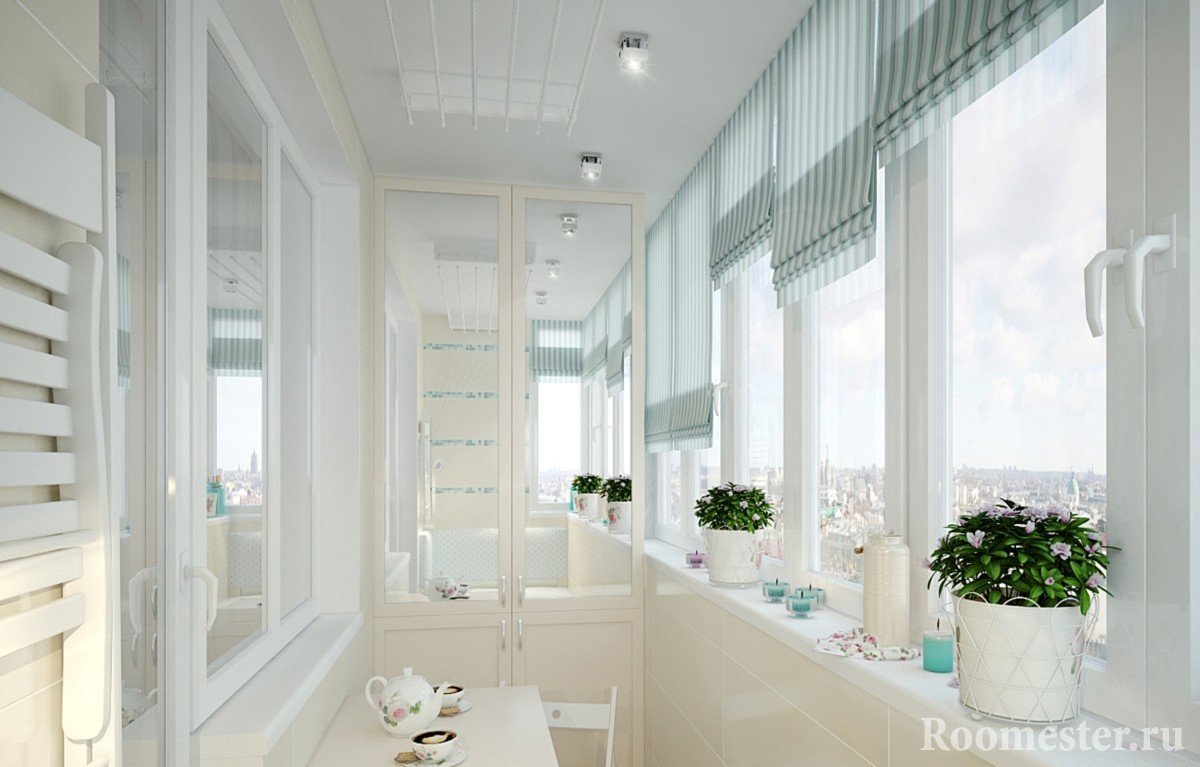 Встроенные шкафы и полочки под потолком – это идеи экономии пространства для маленькой лоджии площадью всего 4 кв.м, которые визуально увеличивают простор. Прямые линии, компактная мебель, яркие светильники и дизайн с белым декором превратят небольшое пространство в хорошо организованную и функциональную комнату.