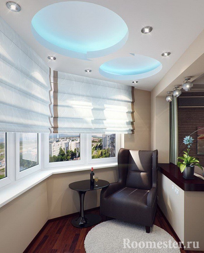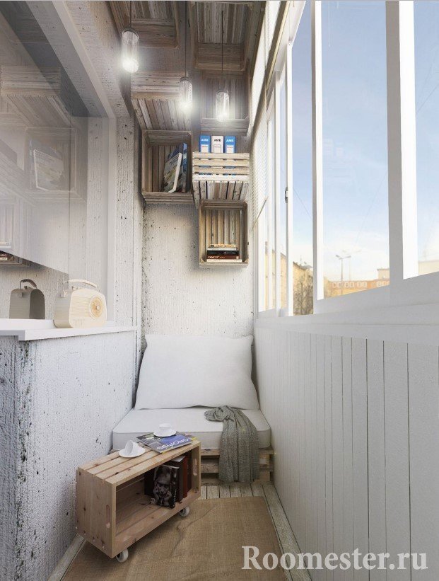 Даже на такой миниатюрной площади можно создать уютный уголок, в котором найдется место для отдыха и для хранения вещей. Можно установить небольшое угловое кресло, под сиденьями которого оборудованы тумбочки, закрепить пристенный откидной столик. Для хранения мелочей подойдут припотолочные полки или антресоли.