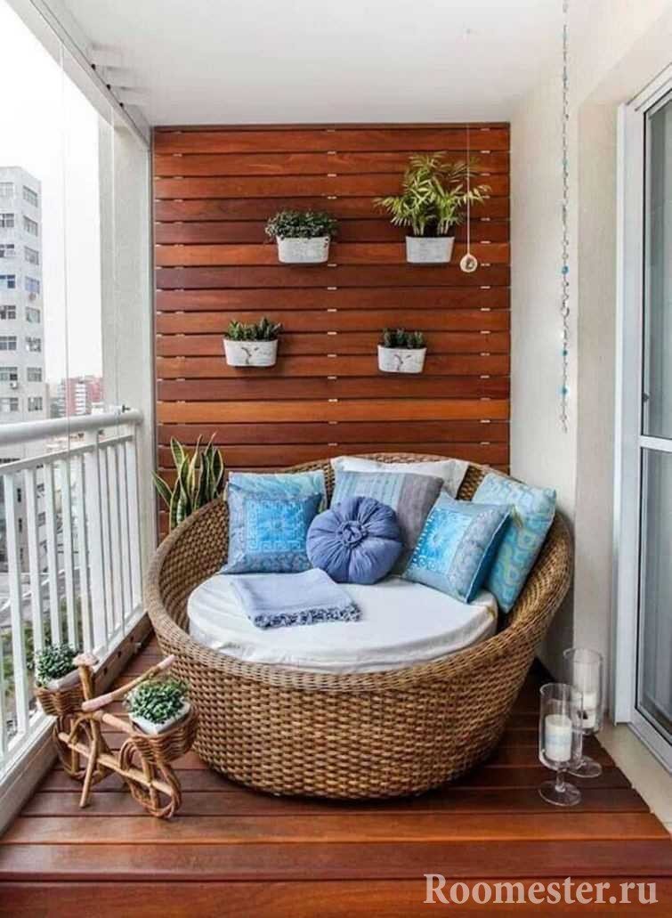 Хорошо на такой балкон впишется кресло-качалка из ротанга или лозы. Если для такового не найдётся места, то выходом станет кресло-гамак. Плетёная мебель, благодаря своей внешней эстетике и приближенности к природе, заряжает определённой энергией и помогает расслабиться.