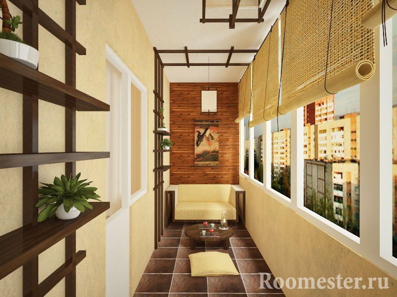 Отличный вариант для ценителей восточной культуры. Сам по себе стиль во всех отношениях является минимализмом, а потому прекрасно подойдет для оформления даже небольшой лоджии. Палитра в основном коричневая с красными и черными деталями. Уместны бамбуковые жалюзи, веера, тематические панно или росписи.