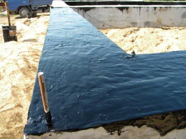На дно выстилают геотекстиль, сверху слоями насыпают песчаную подушку. Каждый пласт проливают водой и утрамбовывают. На глинистой почве высота подложки достигает 50 см, на песчаном грунте — в 2 раза меньше. Следом укладывают гидроизоляцию из битумно-полимерных материалов.