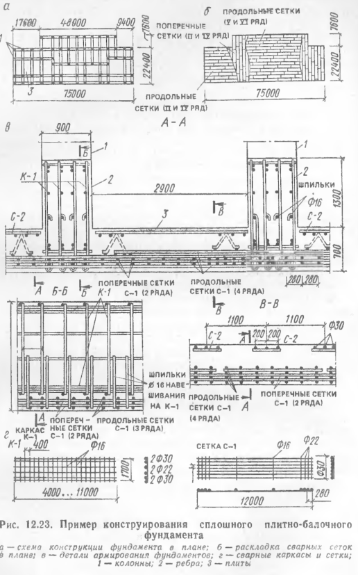 Плитио-балочные сплошные фундаменты армируют сварными сетками и каркасами. На рис. 12.23 приведен пример армирования фундамента многоэтажного здания. В толще плиты уложены двойные продольные и поперечные сетки. Наиболее напряженная зона дополнительно усилена двойным слоем продольных сеток. На местный изгиб плита армирована верхней арматурой, сгруппированной в сетки из трех рабочих стержней; между ними оставлены промежутки для доступа к нижней арматуре. В ребрах плоские каркасы объединены в пространственные приваркой поперечных стержней и связаны шпильками с арматурой плиты.