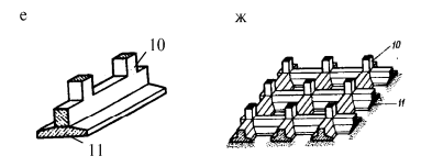 Ленточные фундаменты под колонны (рис.е) выполняются из монолитного железобетона с армированием подошвы и стен фундамента. Устраивается для уменьшения неравномерностей осадки отдельных колонн Если ленты делаются в двух взаимноперпендикулярных направлениях, то фундамент называется фундаментом из перекрестных лент (рис.ж). Данный тип фундаментов имеет ряд преимуществ перед обычными ленточными, так как обладает способностью к выравниванию неравномерных деформаций основания(выравнивает осадку не отдельной колонны, а здания в целом)