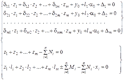 Значения неизвестных находят из решения системы m уравнений совместности деформаций и двух уравнений равновесия: