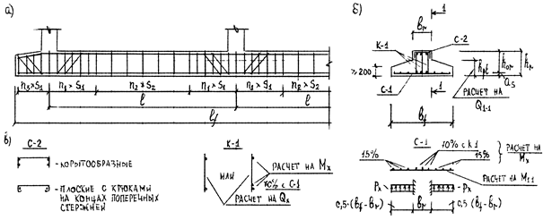 Ленты армируют сварными или вязаными каркасами (см. рис. 12.10, в, г). Плоских сварных каркасов в поперечном сечении ребра должно быть не менее двух при ширине ребра b<400 мм, не менее трех при b=400... 800 мм и не менее четырех при Ь>800мм. Верхние продольные стержни сварных каркасов рекомендуется укреплять на всем протяжении в горизонтальном направлении сварными сетками (корытообразными или плоскими с крюками на концах поперечных стержней), а также в продольном направлении с помощью поперечных стержней в каркасах не реже, чем через 20d (где d — диаметр продольных стержней).