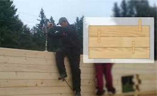 После монтажа обвязки постройка бани из бруса своими руками переходит к возведению стен и на балки укладывается джутовая лента и прибивается степлером. На углах используется один из способов соединения, о которых было рассказано немного выше и показано их изображение. Но помимо угловых креплений все профили должны соединяться между собой и для этого забиваются шканты.