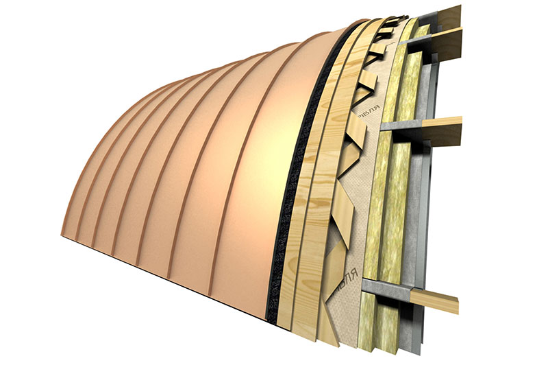 Пирог криволинейной кровли идентичен пирогу прямой кровли. С той разницей, что контррейка там отсутствует. Роль вентиляционного зазора выполняет уложенная доска 100х25 мм сетчатым методом (крест-накрест под углом 45-65 градусов, зависит от кривизны ската). Финальное покрытие чаще всего выполняют шашкой, хотя при кривизне радиусом до 2-4 метров (зависит от материала кровли – сталь, медь и т.д.) возможно использование фальцевых панелей изогнутых специальным способом на криволинейном станке.