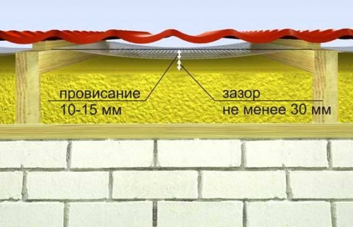 Между стропилами провисание пленки должно быть около двадцати миллиметров. Между теплоизоляцией и пленкой обязательно должен остаться воздушный карман в 40 миллиметров. Для того чтобы обеспечить вентиляцию подкровельного пространства, следует на коньке сделать коньковый продух, то есть зазор между осью конька и краем пленки. Необходимое расстояние отступа равняется 50 миллиметрам.