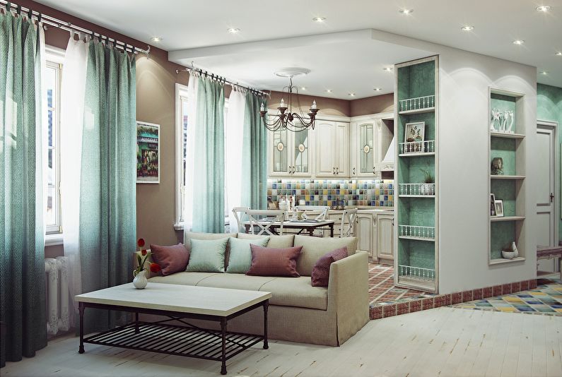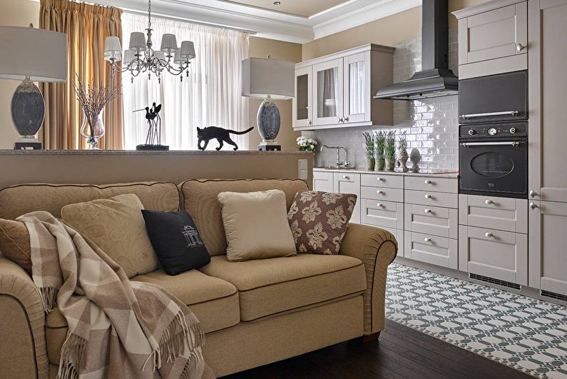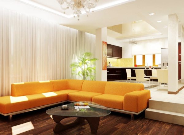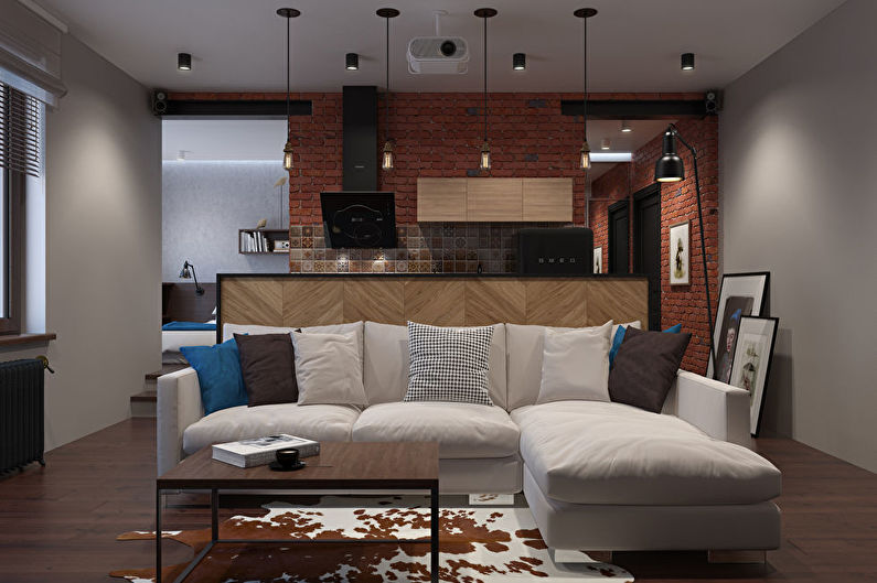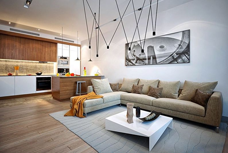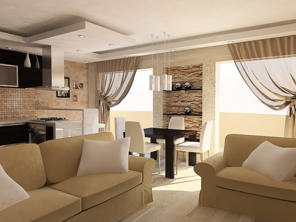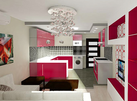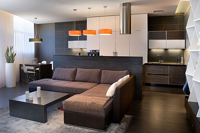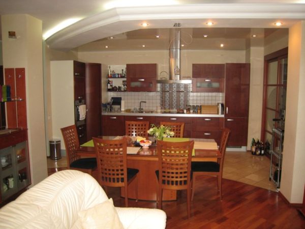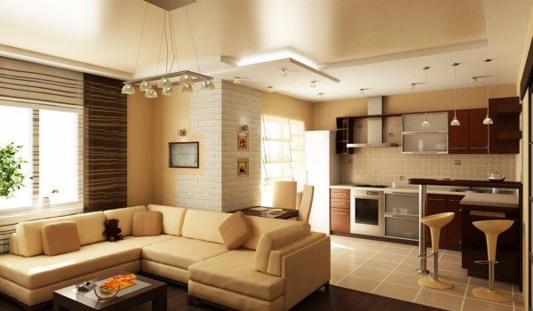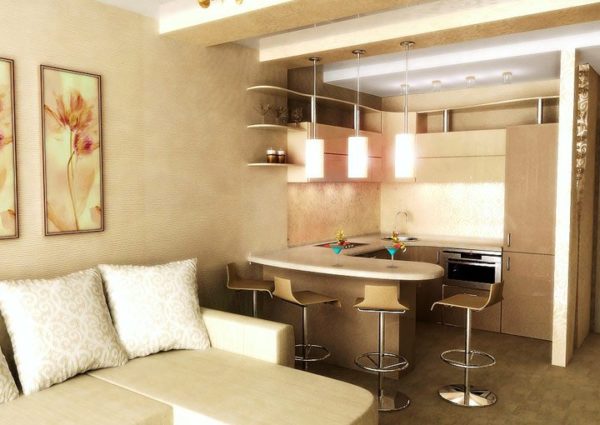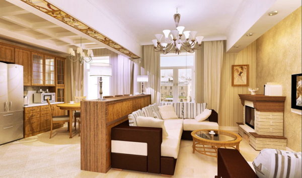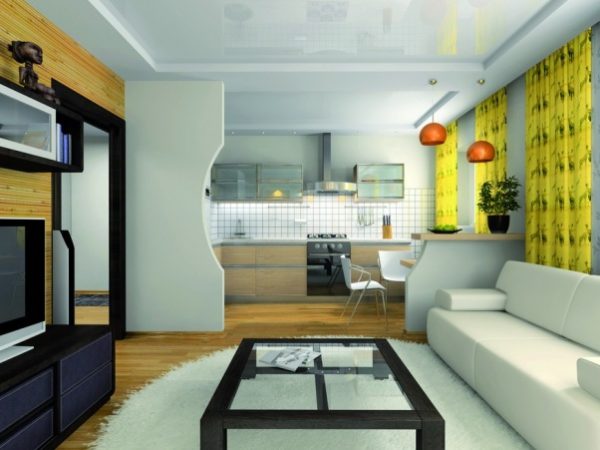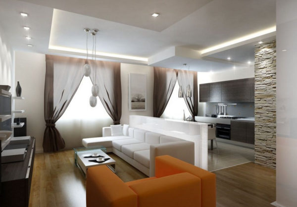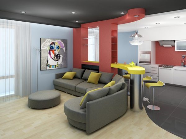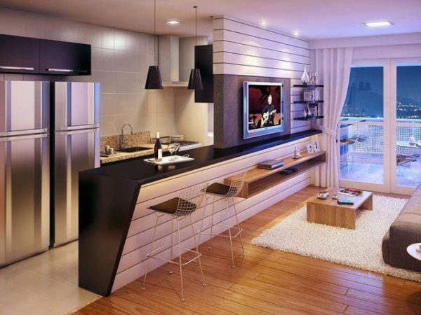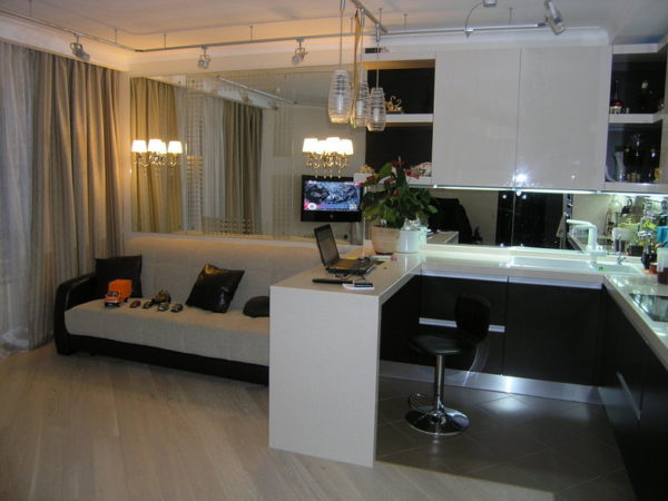 Тогда кухня и сама комната отделяются друг от друга или раздвижными дверями, или барной стойкой. Либо же происходит зонирования помещения с помощью различной высоты потолка, разного напольного покрытия или наличием подиума.