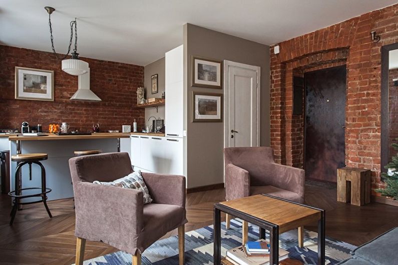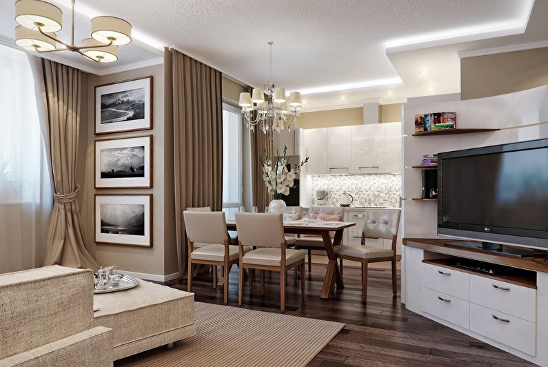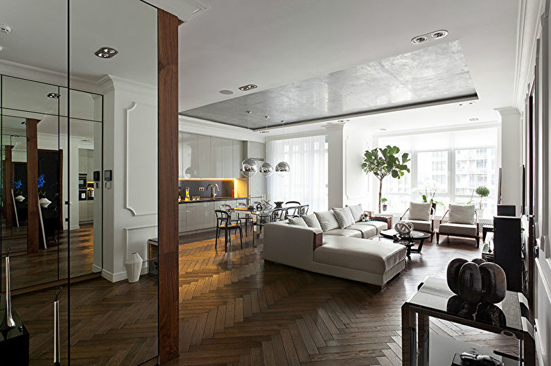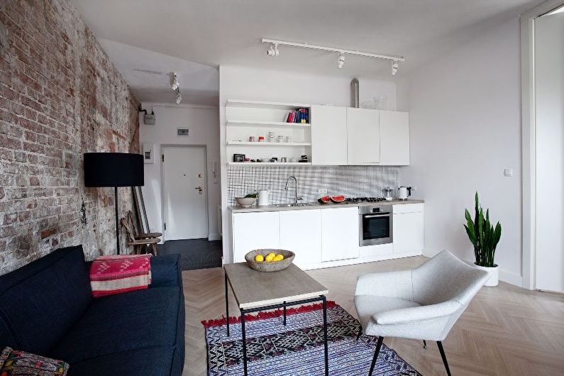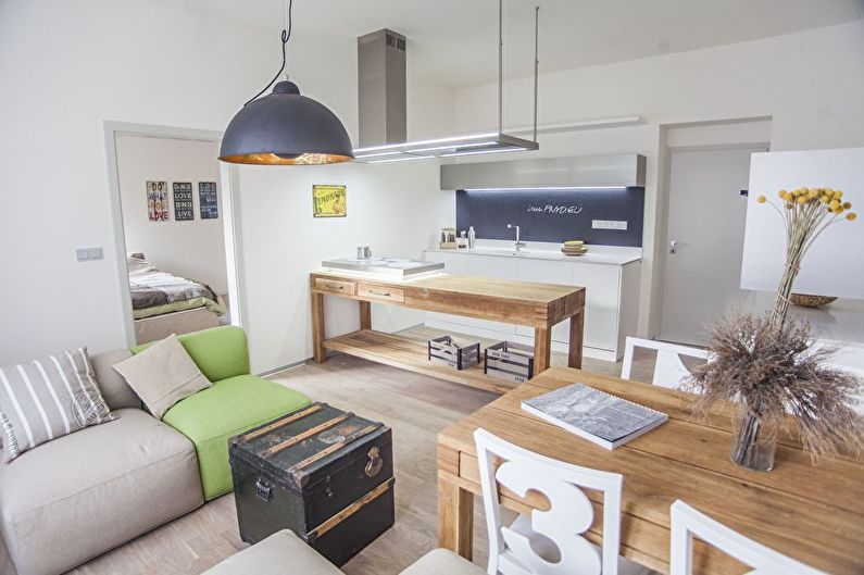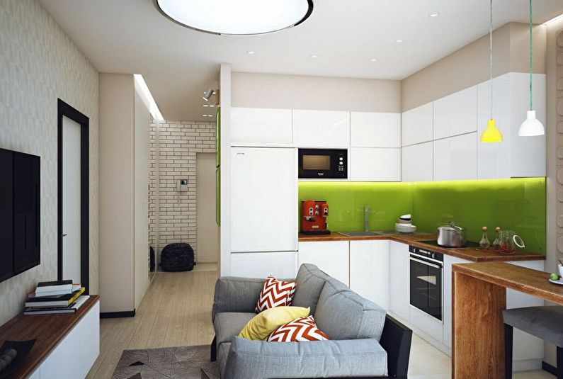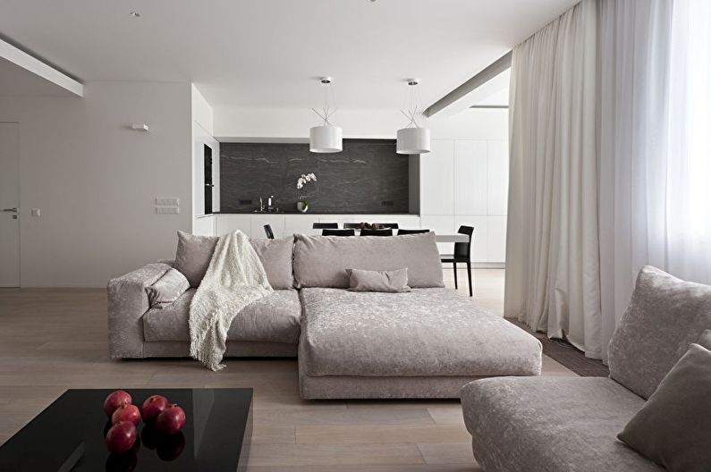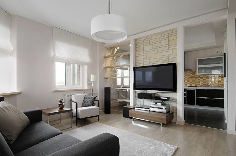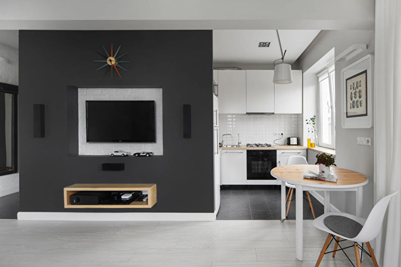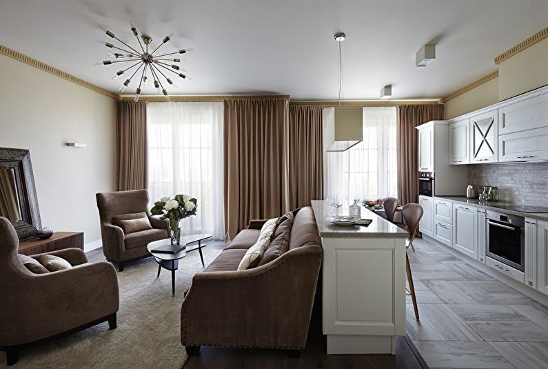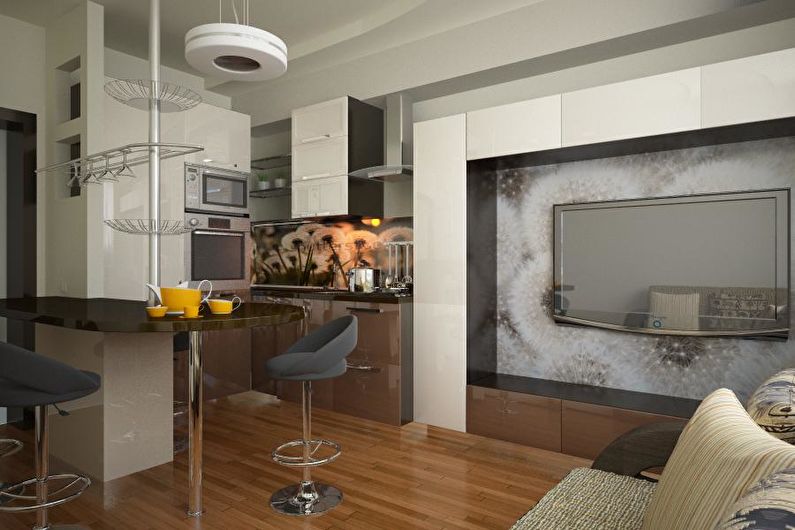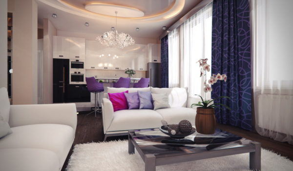 Тогда кухня и сама комната отделяются друг от друга или раздвижными дверями, или барной стойкой. Либо же происходит зонирования помещения с помощью различной высоты потолка, разного напольного покрытия или наличием подиума.