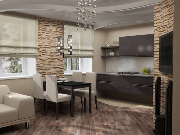В силу практических особенностей, для отделки кухонной зоны следует использовать влаго- и жароустойчивые материалы: керамическую плитку или керамогранит, закаленное стекло, искусственный камень, моющиеся обои, натяжные потолки из пвх-пленки. Однако, чтобы не нарушать единый ансамбль, они должны быть в той же цветовой гамме или хотя бы перекликаться с гостевой стороной помещения. В зоне отдыха будут уместны деревянные поверхности, ковролин, ламинат, декоративная штукатурка, дорогие виды настенных покрытий. Таким образом, само по себе отличие фактур будет визуально разделять помещение, четко очерчивая границы.