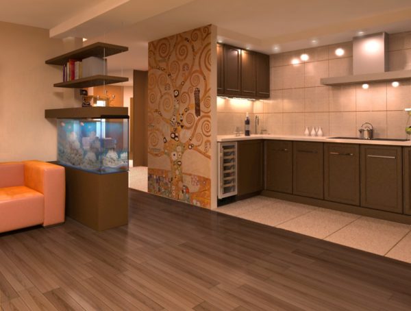 Также можно использовать и одинаковое напольное покрытие на кухни и в гостиной, но разной цветовой гаммы.