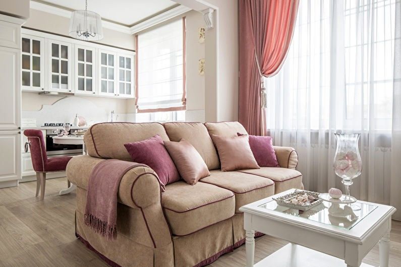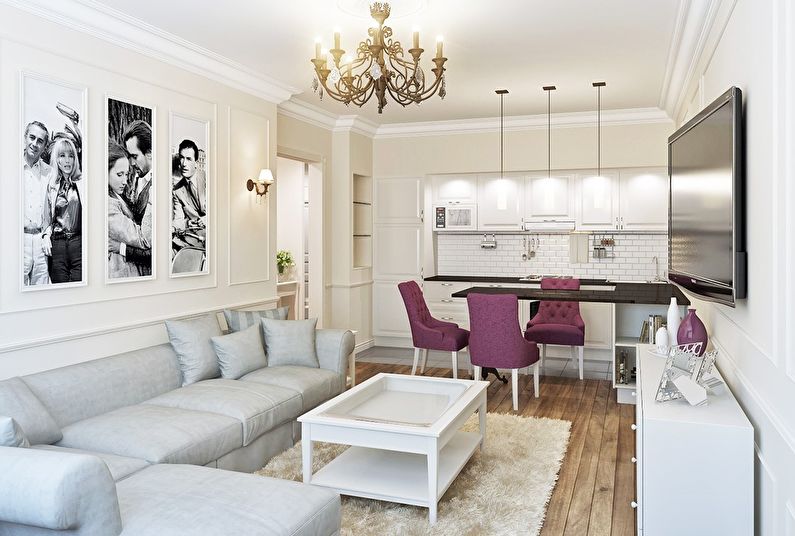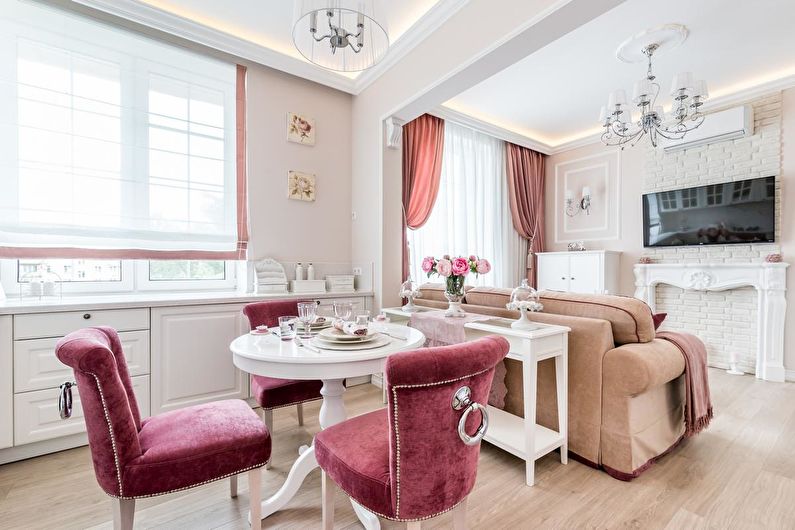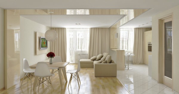 Порой, несмотря на объединение, общая комната получается небольшого размера. В этом случае следует выполнить дизайн обеих зон в светлых тонах: белом, светло-сером или голубом, нежно-желтом, бежевом или бледно-розовом. Такие цвета визуально расширяют пространство. Светлые интерьеры очень популярны: создать стиль своего жилища можно опираясь на фото людей, которые уже применили данные советы на своих квартирах.