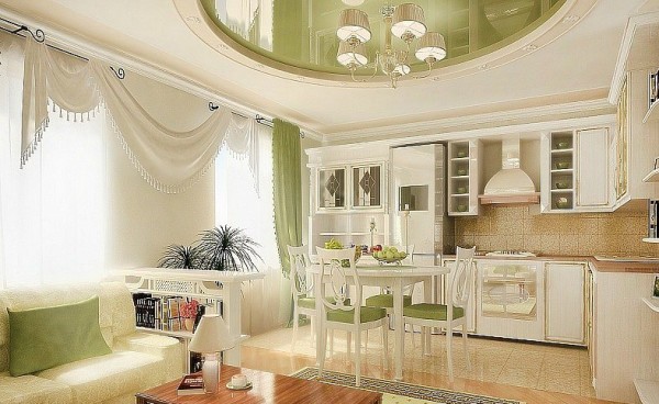 Можно поиграть на контрастах и сделать, например, на кухне простой потолок в спокойных тонах, в то время, как в гостиной – цветной. Либо же наоборот, на кухне установить подвесной яркий потолок.