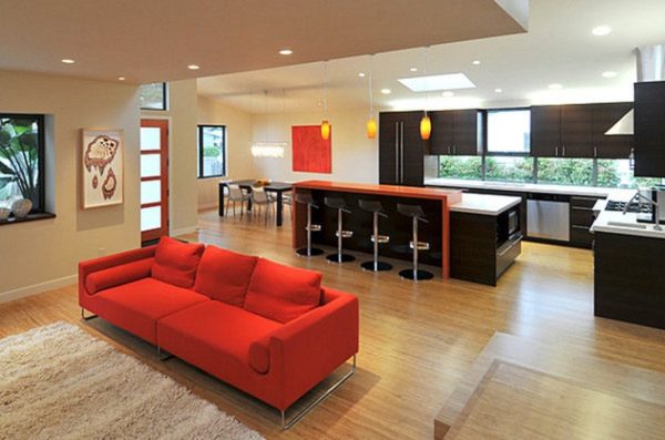 Разделение зон кухни и гостиной возможно при помощи барной стойки. Также можно использовать переходы контрастных цветов на стенах или же разноуровневый пол. Более простые варианты: раздвижные двери или декоративная арка.