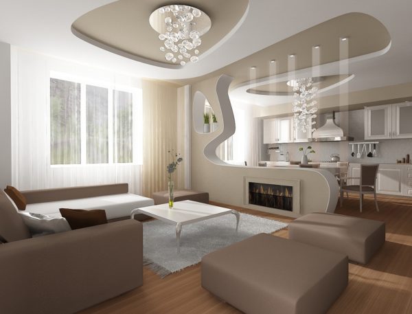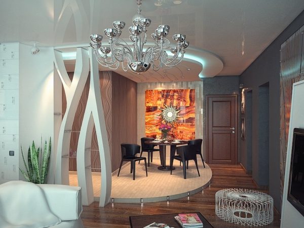 Оригинальным решением может быть использование многоуровневого потолка. При этом очень важно перед его установкой определиться с формой и дизайном.
