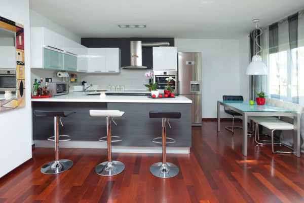 Если не хотите возиться с потолком, тогда примените разное напольное покрытие. На кухне лучше всего класть плитку. Она очень удобна в том плане, что легко моется. При этом современный дизайн позволяет красиво обыграть пол.