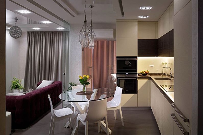 Если обеденную зону планируется скрывать от посторонних глаз, то для разграничения используйте перегородки. Они изготавливаются из небьющегося стекла, дерева, пластика и других современных материалов. В зависимости от идеи перегородки сдвигаются в сторону или складываются гармошкой. Фото такого дизайна можно увидеть в сети по соответствующему запросу.