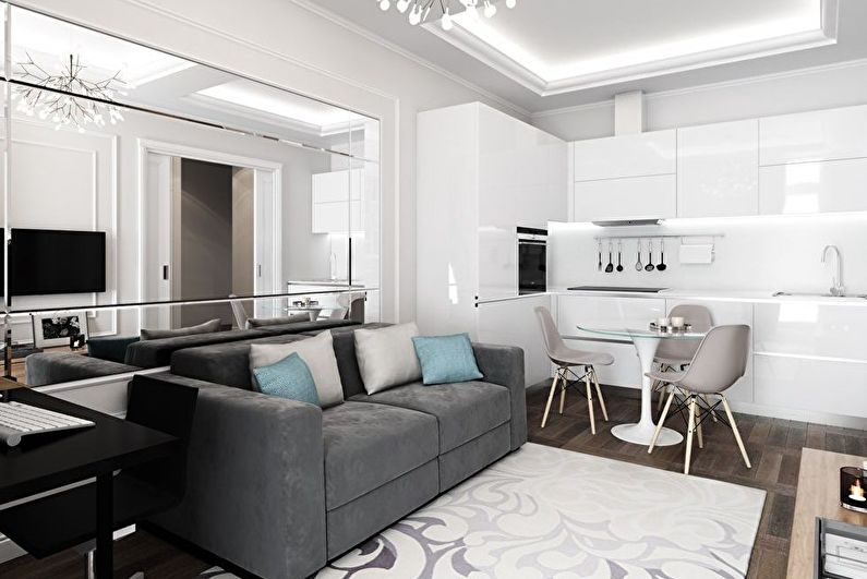 Интерьер большинства современных студий отражает ритм жизни в мегаполисе: никаких лишних деталей, каждая вещь на своем месте и минимум затрат усилий для домашних дел. В такой обстановке преобладают ахроматические цвета, сталь, гладкие ровные поверхности без каких-либо выступов, декора и фурнитуры, техника с сенсорным управлением. Этот лаконичный дизайн кухни-гостиной идеален для занятых людей, которые ценят свое время.