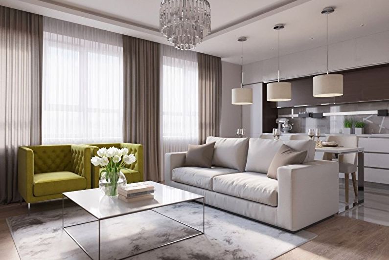 Дизайн совмещенной комнаты во многом зависит от вида мебели, который располагают на одном пространстве.