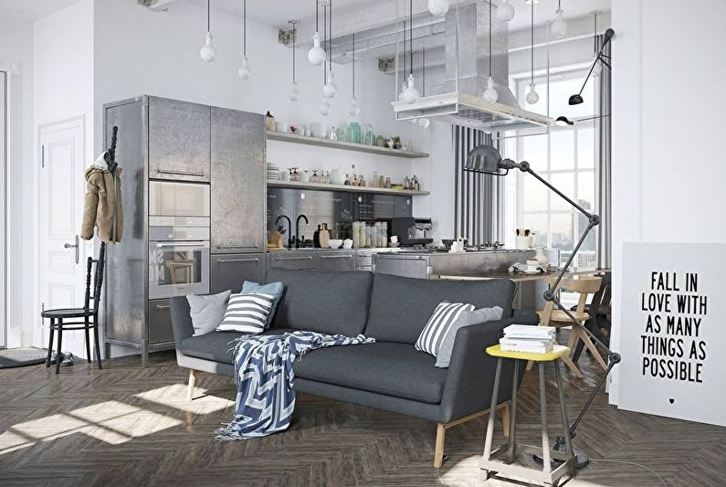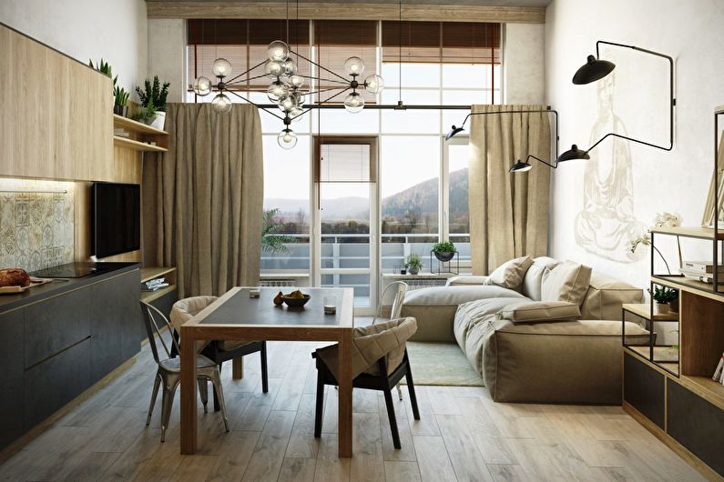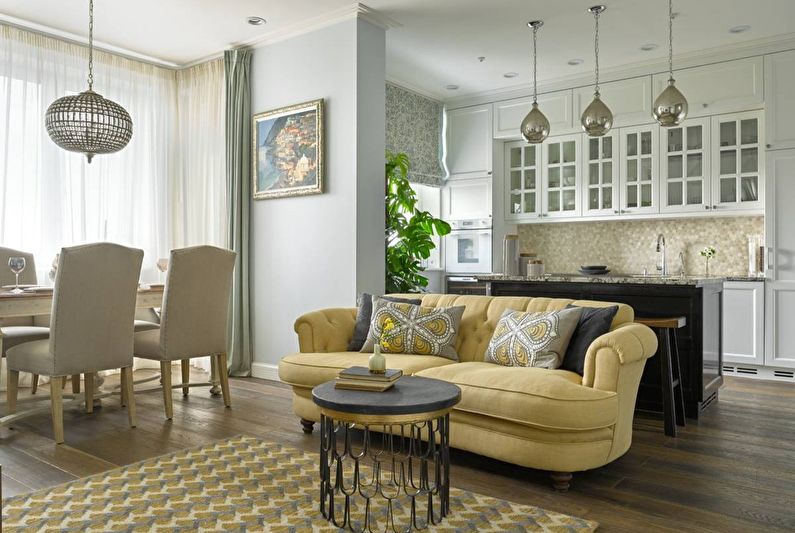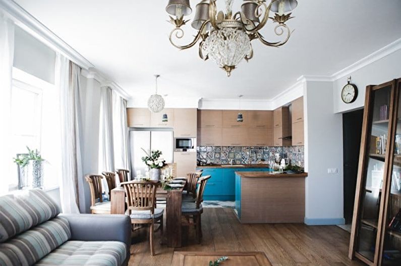 Чтобы оформление кухни, совмещенной с гостиной, смотрелось целостно — перед началом работ стоит определиться, в каком стиле их выполнять. В дальнейшем именно от этого будет зависеть выбор всех элементов, начиная от отделки и заканчивая декором. Для студии, если учесть ее специфику, больше подходят сдержанные, нейтральные направления с акцентом на функциональность и эргономичность.