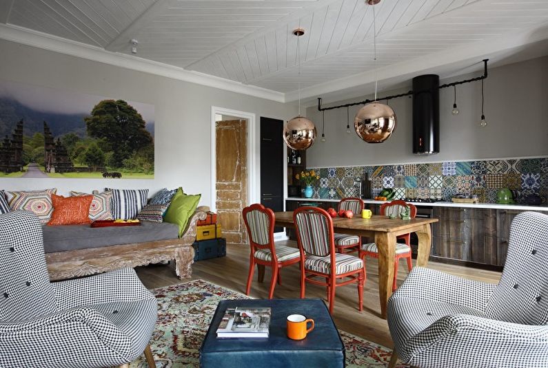 Не следует слишком увлекаться контрастами. Лучше всего отдать предпочтение схожим цветам и мотивам. Также можно выделить зону кухни подиумом.