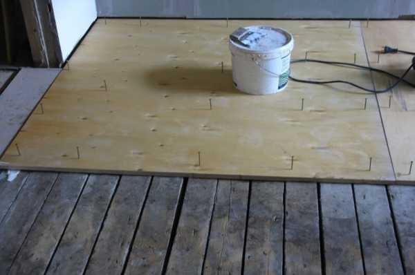 Не очень бюджетный, но весьма действенный способ избавления чернового пола от скрипа — настил на него фанеры с частым притягивающим креплением саморезами. Толщина настила должна быть не менее 12 мм, крепление выполняется в каждую доску в два ряда в шахматном порядке не далее 30–35 мм от края.