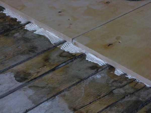 Помимо саморезов добиться качественного сцепления поможет смесь опилок или минеральной крошки с клеем-бустилатом. Важно располагать листы настила таким образом, чтобы стыки между ними не способствовали прогибу досок в дальнейшем. В идеале следует разделить дополнительный настил на два слоя по 6–8 мм, скрепив их между собой клеевой смесью и тщательно продумать схему перевязки стыков.