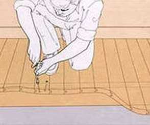 Другая тонкость заключается в необходимости сверлить доски перед вкручиванием саморезов, чтобы избежать зацепа резьбы в них. Метод идеально подходит для устранения скрипа в черновом полу. Чистовые покрытия тоже можно укрепить саморезами, но следы от шляпок придётся маскировать шпаклёвкой, которая, к тому же, должна быть подобрана в тон дереву при вскрытии полов лаком.