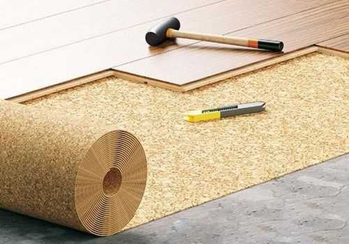 После того как основание под напольное покрытие готово, можно положить ламинат на деревянный пол. Поверх основания (листа ДСП или фанеры) укладывают подложку. Это может быть пробка или специальный полиэтилен. Листы подложки укладываются стык в стык и для обеспечения их неподвижности применяют строительный скотч.