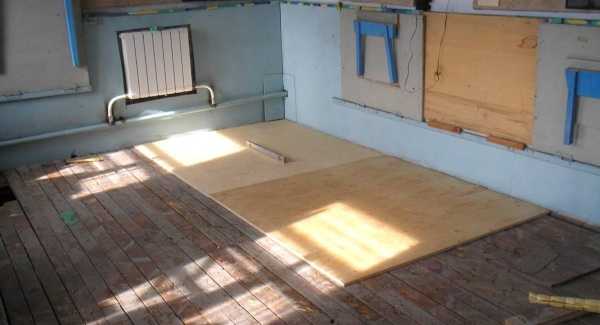 Распространенным вариантом считается выравнивание старого деревянного пола с помощью фанеры, которую укладывают на заранее укрепленный пол. Толщина фанеры должны быть примерно 10-12 мм. До момента укладки на старый пол, фанеру следует предварительно проолифить или обработать лаком и хорошенько просушить.