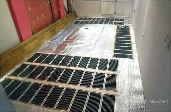 А еще необходимо постелить подложку, непосредственно пленку, поверх нее полиэтилен, а в завершение напольное покрытие (плитка, ламинат, линолеум).