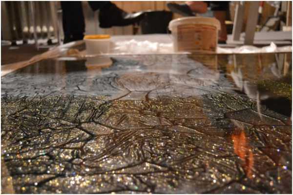 В емкости, с помощью дрели со специальной насадкой смешиваем компоненты прозрачного пола. Затем, на поверхность с изображением выливаем готовую смесь. Смесь разравниваем по полу.