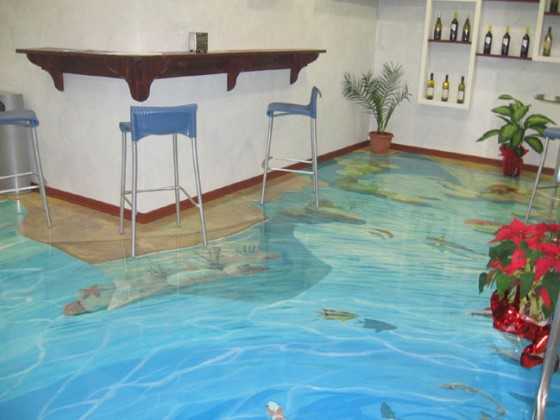 Трехмерные декоративные полы – это уже не редкость. Наличие высококвалифицированных мастеров с практическим опытом работы позволяет воплотить любые художественные полы. Причем здесь нет никаких ограничений. Уже сегодня есть возможность создать полы с визуальным трехмерным эффектом. Такие 3д полы в интерьере смотрятся очень интересно. Также в основу можно заложить любую картинку и даже фотографию. Достаточно ее просто качественно увеличить и уложить на полимерную основу. Дальнейший этап создания такого декоративного пола в комнате – это нанесение прозрачного и защитного полимера.
