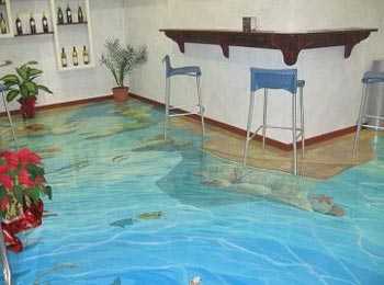 Но наиболее привлекательно выглядят полы 3d, изготовленные своими руками с применением ярких наклеек и картинок. В данном случае, в первую очередь выравнивается поверхность при помощи базового полимерного раствора. По истечении 25-30 часов, когда поверхность просохнет, на нее наносят вылаживают выбранные картинки, при этом, как правило, ее размер должен соответствовать площади заливаемой площади. После этого наклеенное изображение покрывается прозрачным раствором, при помощи которого образуется пластиковая линза, каковая в свою очередь, покрывается финишным защитным слоем. Стоит посмотреть на готовые произведения дизайнерского искусства – наливные полы 3д фото которых не оставит вас равнодушными.