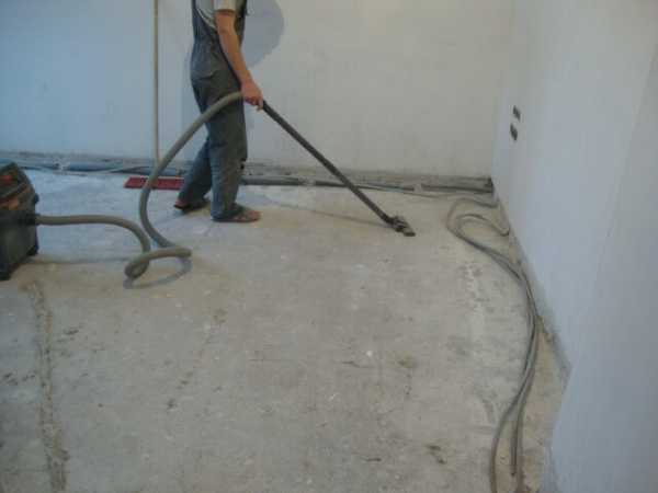В комнате, где планируется заливной пол необходимо снять предыдущее покрытие вплоть до стяжки. После того, как старое покрытие снято необходимо поверхность тщательно убрать от грязи, ошметков и мелких деталей. Для этого лучше использовать пылесос.