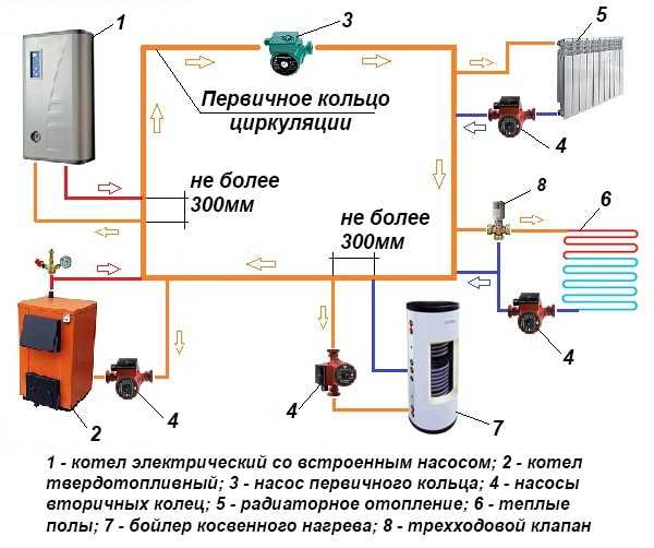 Теоретически в главный контур может быть включено сколько угодно источников тепла и вторичных колец. Главное, верно подобрать диаметры труб и производительность насосных агрегатов. Фактическая производительность главного кольцевого насоса должна превышать расход в самом «прожорливом» вторичном контуре.