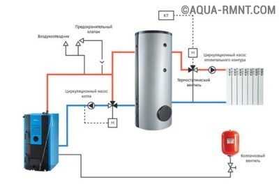 Поэтому большое распространение получили обвязки отопительных систем с аккумулятором. В качестве такого элемента используется бойлер с трехходовым клапаном. При первичном нагреве теплоносителя происходит рост температуры воды в аккумуляторе. При прекращении работы котла или снижении эффективности нагрева, температура поддерживается путем поступления нагретой жидкости из бака, которая ранее была доведена до заданных параметров.