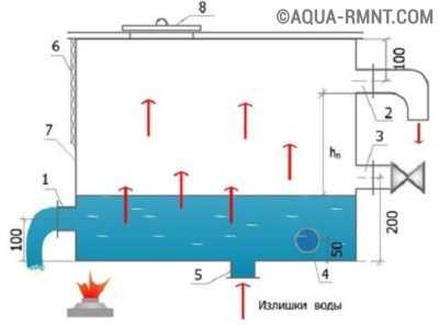 Главной особенностью открытых отопительных систем является контакт теплоносителя с атмосферным воздухом, который происходит с участием расширительного бака. Эта ёмкость призвана компенсировать тепловое расширение теплоносителя, которое происходит при его нагревании. Расширитель врезают в самой высокой точке системы, а для того, чтобы при переполнении бака горячая жидкость не заливала помещение, к его верхней части подключают сливную трубку, второй конец которой выводят в канализацию.