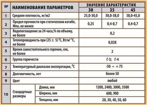 Основные параметры утеплителя данной категории: коэффициент теплопроводности (0,029-0,034 Вт/(м*С)), показатель влагопоглощения не более 0,4%, плотность (в пределах 38-45 кг/куб. м), незначительная паропроницаемость (0,013 Мг/(м*ч*Па)).