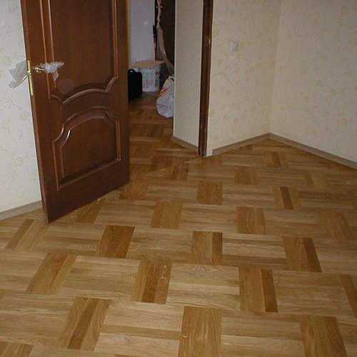 Куски влагостойкой фанеры крепятся на основание с помощью шурупов или специального клея. Далее фанера шлифуется. На полученную поверхность выполняют монтаж штучного паркета на паркетный клей, при этом каждая планка крепится на гвозди. Завершив сборку, паркет необходимо отшлифовать специальным оборудованием. Чтобы поверхность приобрела идеальную ровность, нужно выполнить шлифовку в три этапа: ленточную, плоскую и угловую.