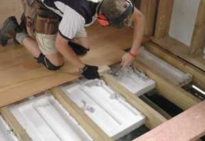 По логике вещей деревянный дом предполагает и обустройство деревянного пола, если его владелец заботится об экологически чистой окружающей обстановке. К тому же технология укладки и монтажа отработана веками, и что-то новое и оригинальное сводится только к облегчению труда при проведении этих работ. Если уж и решили возводить дом из дерева, то и пол тоже возводят деревянным, ничего другого даже и не приходит на ум для его обустройства. И другие варианты могут привести к нарушению эстетического восприятия всего дома в целом. Издавна дерево признавалось как чисты и теплый вариант для настила, от него идет несинтетический, а натуральный запах самого дерева, что создает неповторимую атмосферу уюта и комфорта. В основном используется специальная половая доска, к которой применяются строительные нормы: Неоспоримыми преимуществами деревянных полов являются: Но как и любая вещь, так и деревянное перекрытие, у него есть ряд своих небольших недостатков: Обустройство пола следует проводить при соблюдении следующих правил: После установки балок и лаг следует провести некоторые основные работы: Монтаж можно сделать двух видов: Что необходимо подготовить для чернового варианта? Кроме основного набора нужно заготовить анкеры, большой длины гвозди, брусья и лаги. Обращаем внимание, что сам дощатый материал кладут в перпендикулярном направлении по отношению к лагам, скрепляются прочными шурупами или гвоздями с винтовой нарезкой. Для амортизации и устранения скрипа между покрытием и основанием лучше проложить любой прорезиненный материал. Следует оставлять небольшие зазоры между несущими стенами и первой к ней доской примерно около 10 см, это предусматривают строительные правила во избежание нарушения всей конструкции дома при повышении температуры окружающей среды. Обращаем внимание, что установка лаг непосредственно на грунт приведет к их быстрому гниению, и только по этим причинам и для обеспечения долговечности конструкции основание кладут по столбчатому фундаменту или бетонную стяжку. Кирпичные столбики будут изолировать соприкосновение стен с напольным перекрытием, что приводит к низким вибрационным эффектам и улучшенной звукоизоляции. Но и отнимет полезную площадь в помещениях. А обустройство стяжки привлекательно тем, что она может обеспечить полноценную тепловую защиту. Все должно высохнуть, качественная просушка может занять не менее 30 дней. Можно использовать шлифовальную машину или циклевку, но результат должен быть один- идеально ровная поверхность, где ни мебель, ни другие предметы будут стоять без крена в ту или другую сторону. Деревянные полы уже долгое время не теряют своей актуальности и популярности среди потребителей. При этом речь может идти как о деревянных перекрытиях, так и о напольном покрытии из дерева. Деревянные перекрытия обычно производятся по балкам. Этот способ чаще всего применяется в деревянном строительстве. И имеет свои достоинства и недостатки. Преимущества: Недостатки: Если же проводить настил полов по лагам, то можно выделить ряд преимуществ: Недостатками можно назвать: Перед проведением работ, балки, доски и все деревянные материалы нужно просушить и произвести обработку антисептиком. Дополнительно необходимо обработать огнеупорным раствором. После этого они должны полежать