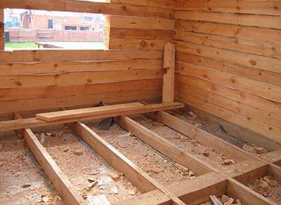 Под лагами можно провести все инженерные сети. Также они скроют возможные неровности пола. Единственный минус – это невозможность укладывать лаги в комнатах с невысокими потолками. Это объясняется тем, что при укладке забирается до 10 см высоты.В комнатах с невысокими потолками применяется другой способ – укладка деревянных досок и слоя гидроизоляции.