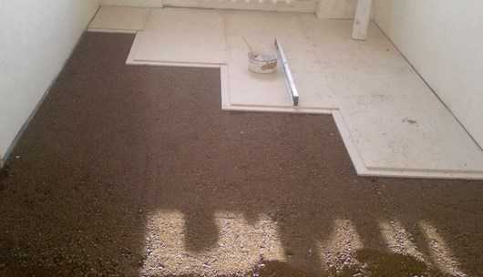 На каждую опорную отметку наливается цемент, а сверху прижимается профилем, а остатки раствора убираются шпателем. После того, как раствор под маяками высохнет, засыпается керамзит с последующим разравниванием. После окончательного выравнивания специальным инструментом проверяются профили, которые не должны сгибаться.