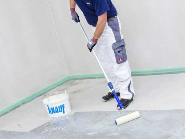 Наносим грунтовочный слой из готового материала для закрытия пор в бетонной поверхности с использованием валика. Грунтовочный слой должен просохнуть в течение 8-12 часов по заваленным рекомендациям производителя.